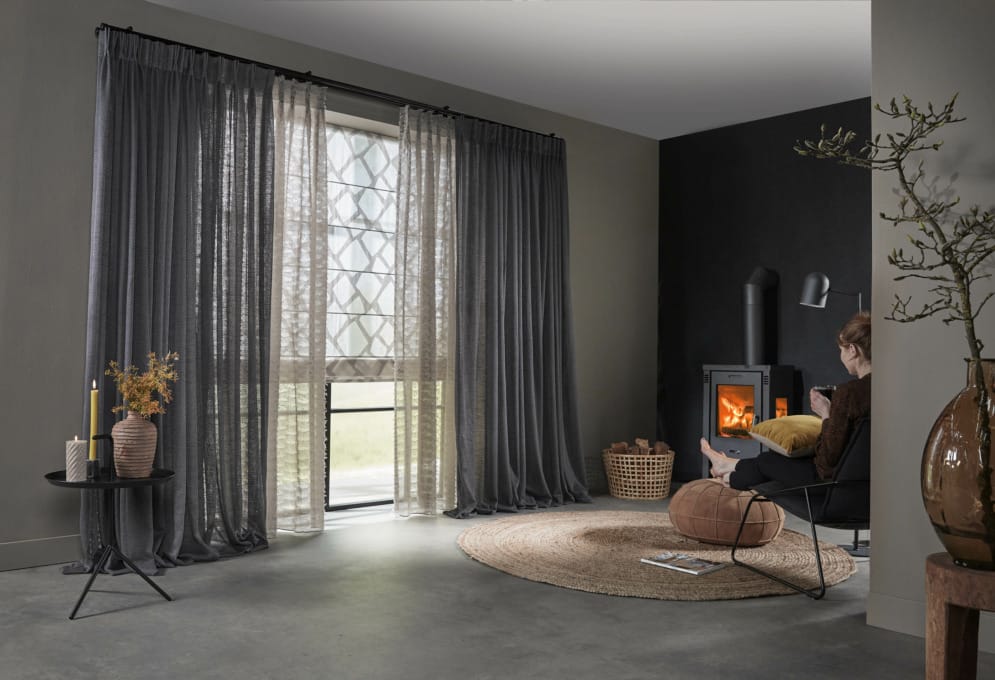 Earth ist ein glatt gewebter, transparenter Stoff mit natürlichem Aussehen, der mit mehrfarbigen Garnen gewebt wurde, um einen lebendigen Mélange-Effekt zu erzielen. Der Stoff ist in 6 zugänglichen Farben erhältlich, die von Nude bis Schwarz mit braunem Touch reichen. Diese Farbpalette passt hervorragend zu verschiedenen Einrichtungsstilen, wobei der Schwerpunkt auf einem natürlichen Look liegt. Da dieser Stoff raumhoch ist, sind in der Konfektionsware keine Nähte sichtbar. Für einen üppigen Look empfehlen wir eine Dreifachfalte und für einen modernen Look die Wellenfalte.