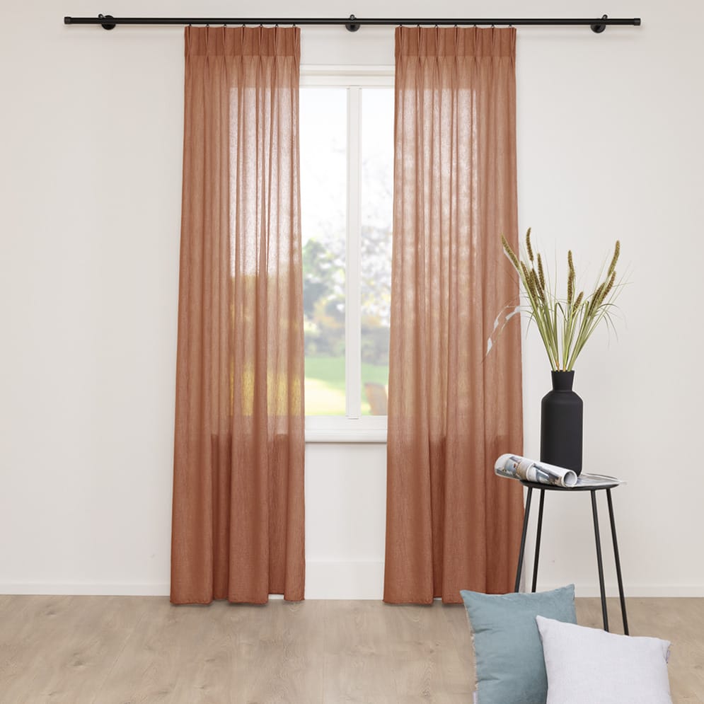 De Oasis is een hoogwaardige, vlamvertragende en luxe transparante stof. De Oasis heeft 12 kleuren. Omdat deze stof vlam vertragend is, is deze zowel thuis als in hotels en kantoren perfect toe te passen. Deze transparant is mooi in combinatie met een uni overgordijn of een uni vouwgordijn. De stof is onderin voorzien van een verzwaringskoord waardoor deze mooi valt en er geen zoom nodig is. De stof bestaat voor de helft uit duurzame gerecyclede garens.